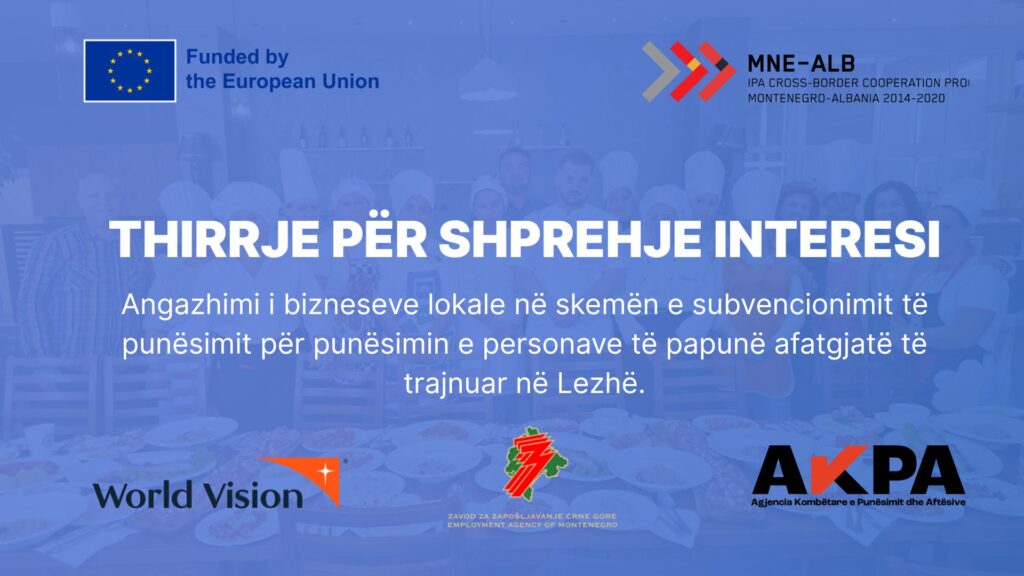 Organizata World Vision Albania, në kuadër të projektit të financuar nga Bashkimi Evropian “Nxitja e Punësimit të Denjë për të Rinjtë dhe Personat e Papunë Afatgjatë në Zonën Ndërkufitare të Malit të Zi dhe Shqipërisë”, shpall thirrjen për shprehje interesi për bizneset lokale të Bashkisë Lezhë (Qytet dhe Njësia Administrative Shëngjin) për t’u përfshirë në Skemën e Subvencionimit të […]