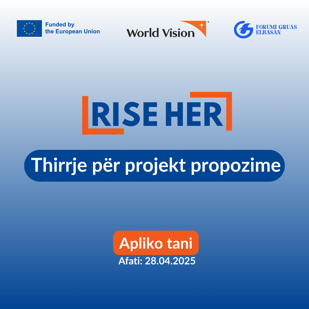 World Vision Albania, together with the Women’s Forum Elbasan, announces the open call for project proposals for civil society organizations in the District of Elbasan, within the framework of the project “RISE HER (Revitalize Independence and Solid Empowerment for Her)” financed from EU funds.